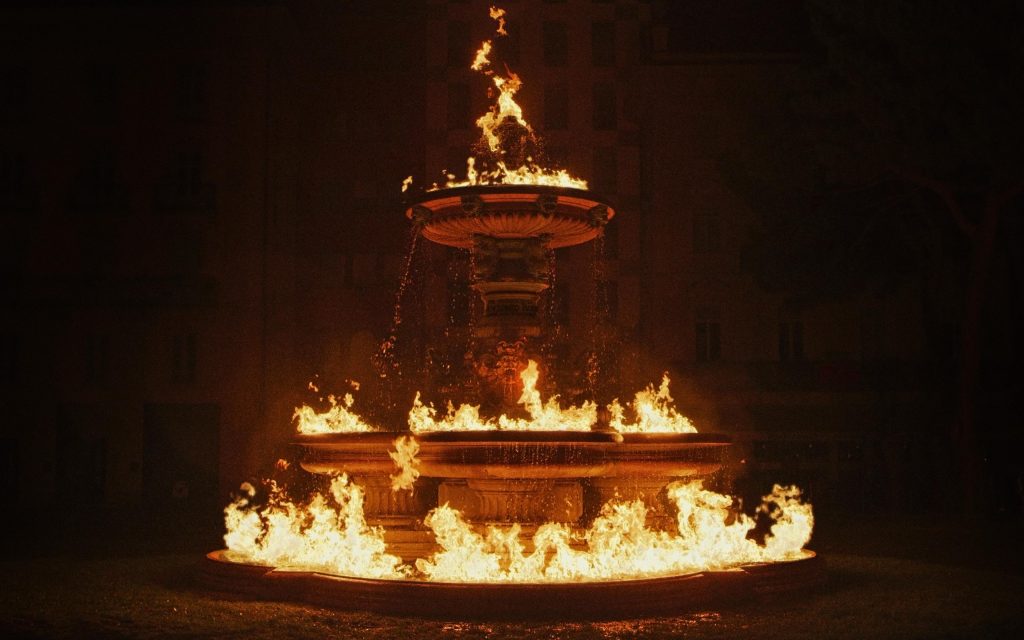 In this film, Charrière’s fountain depicts an absurd state that implies the coexistence of opposite elements, water and fire. The artist turns the traditional iconography of the fountain on its head in symbolic terms too: the connection with water and the concept of a spring of life now dominated by flames. Fire has an ambiguous meaning, for it is not just an element of destruction but is also considered humankind’s oldest conquest, corresponding to the beginning of civilization. It is no coincidence that Charrière juxtaposes the remote locations of the glacial landscape not only with the element of fire, but also with the ancient symbol of its earliest settlements: the fountain.