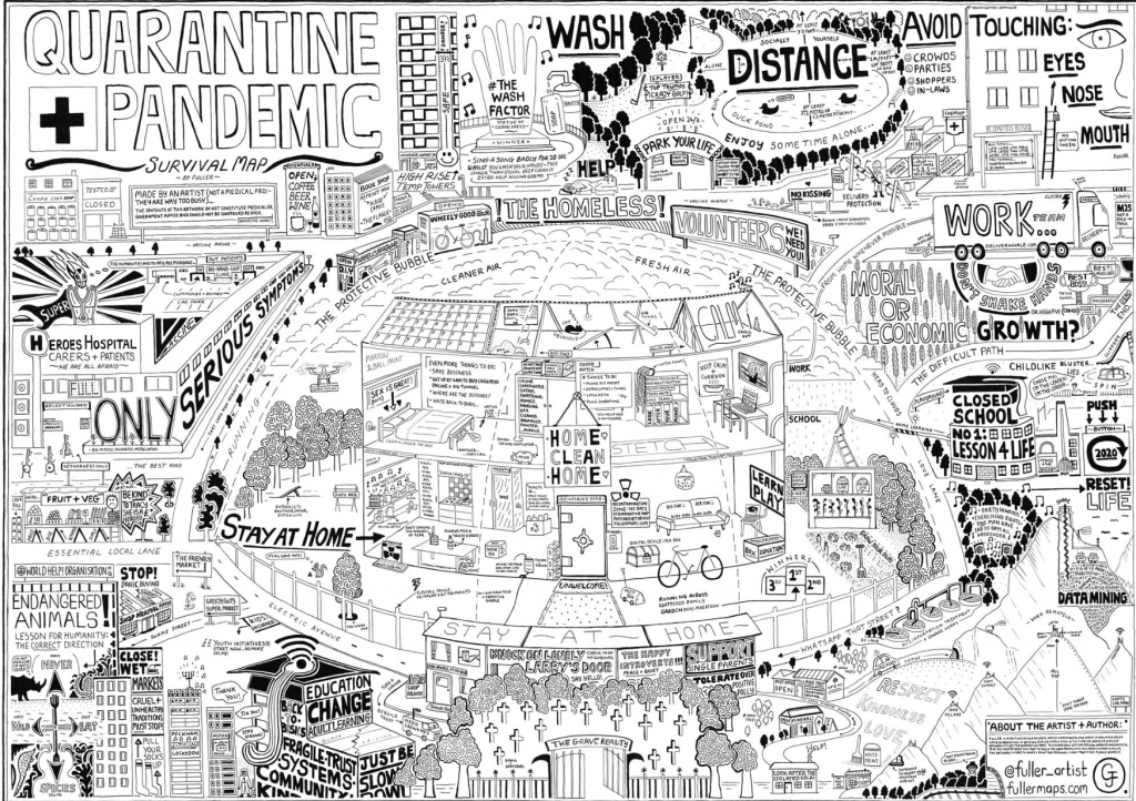 A map/ diagram that explores the artist’s emotions, perspectives, and the physical activities he did during the lockdown. The highly detailed map utilises illustrations and texts effectively to create an almost like ” a diagram” that engages people into reading and looking closely at the information.
